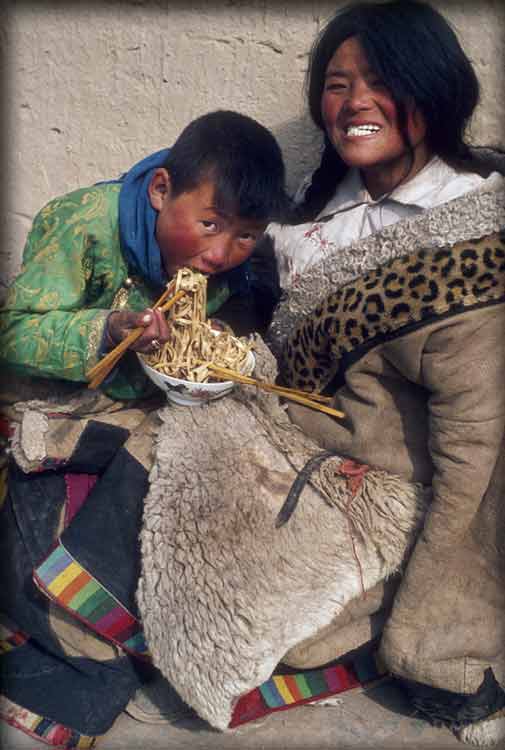 Tibetans: Snatching a Hasty Meal, 1983, Gansu, China; archival color print, 30" x 20"