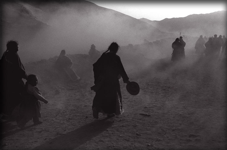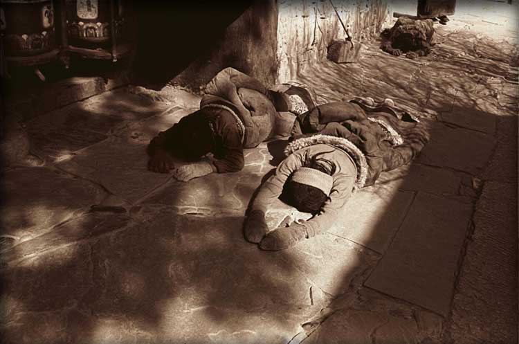 | Tibetans: Praying Expeditors, 1983, Gansu, China; archival sepia tone print, 20" x 30" |